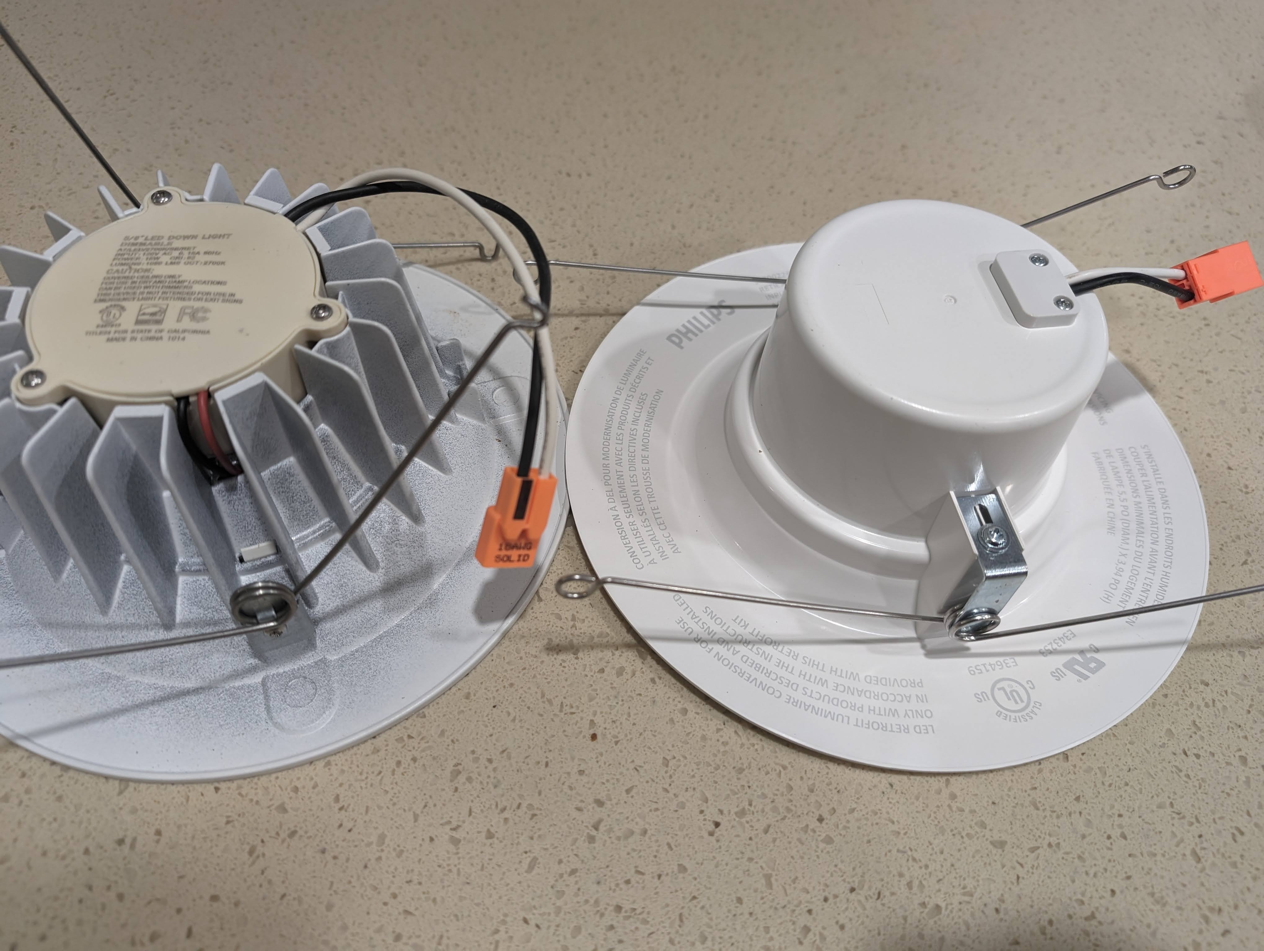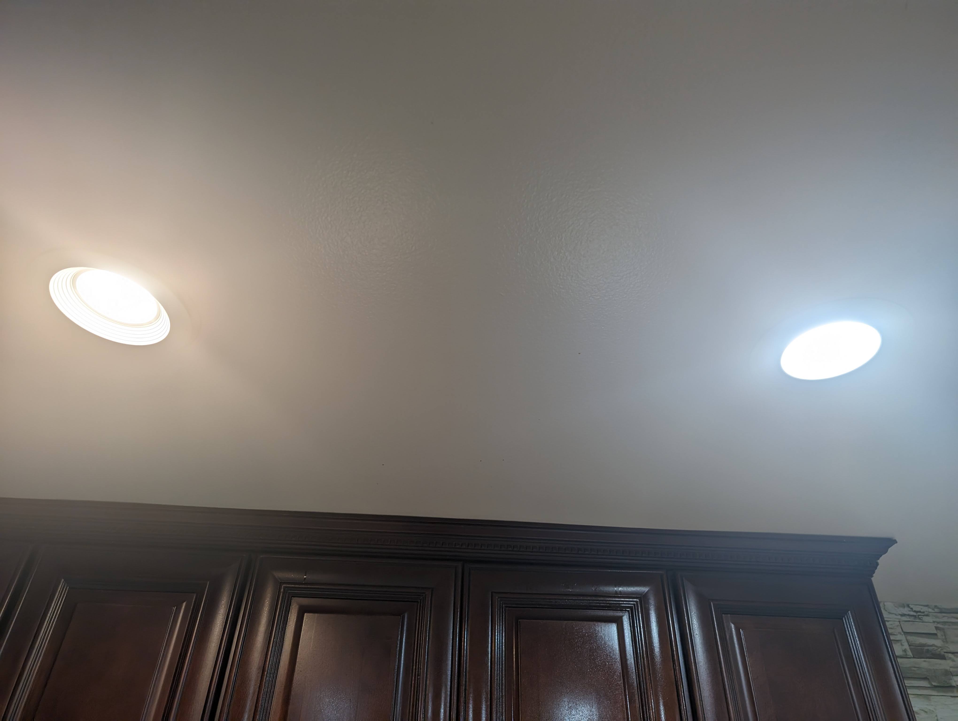 왼쪽이 기존에 집 들어오기전 공사할때 컨트랙터가 지맘대로 설치해놓은 제조사모를 중국산 리세스라이트 (2700k), 오른쪽이 이번에 제가 구입해서 바꾼 필립스 5000k 리세스라이트 입니다.