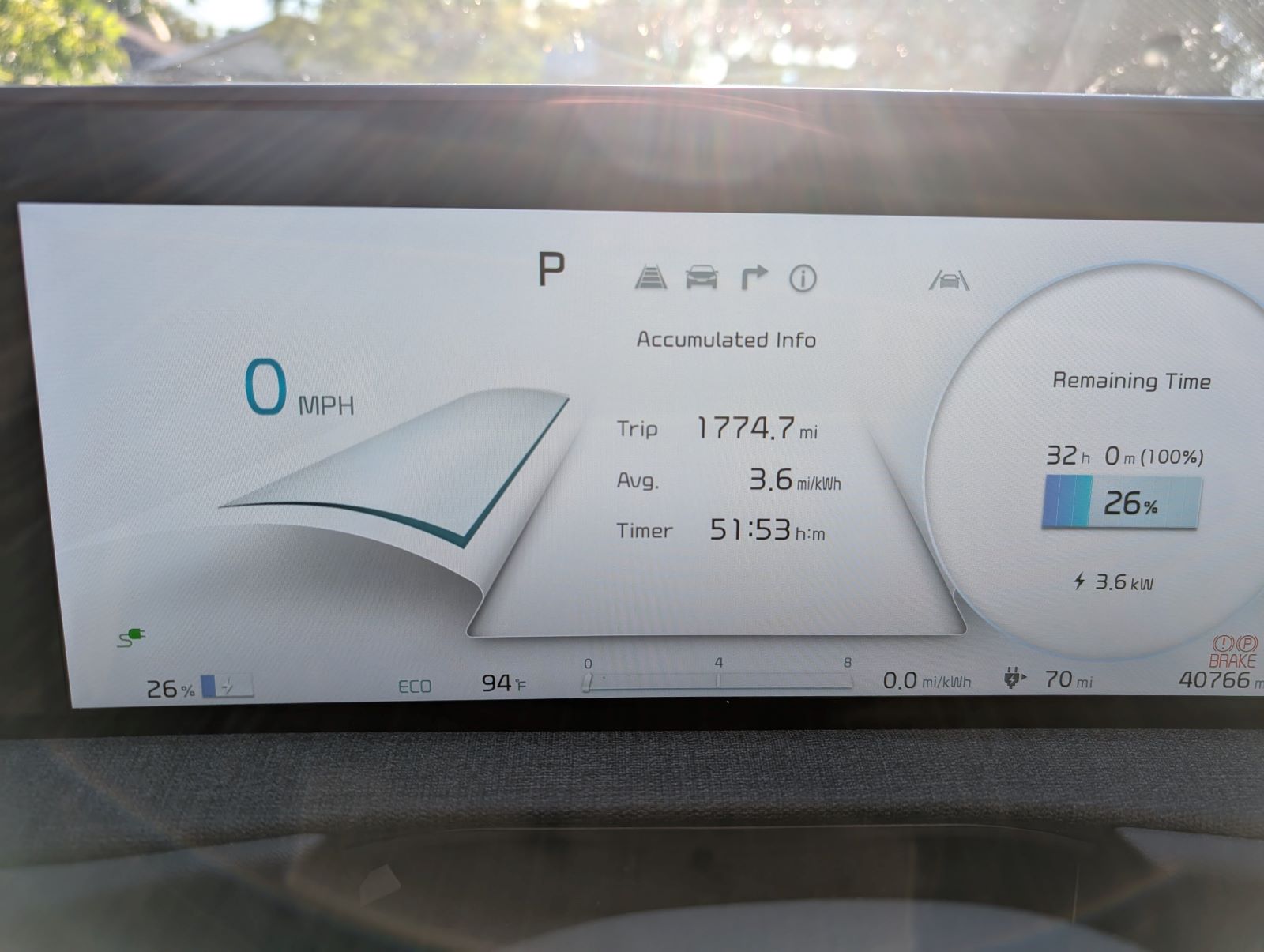 전비가 3.6mi/kWh 나왔는데, 고속으로 쭉 달린거 생각하면 나쁘진 않은것 같습니다.